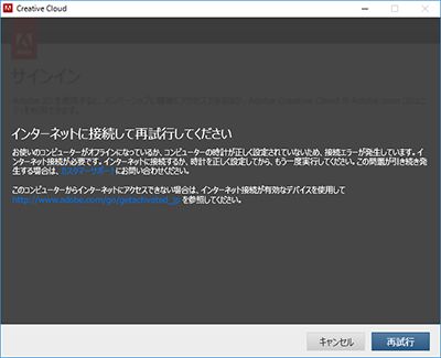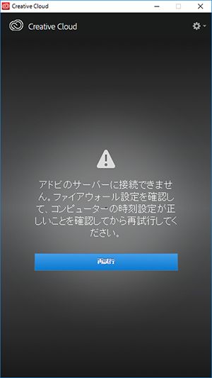 シリアル番号ライセンスの場合、本来 Creative Cloud デスクトップアプリケーションは不要のためインストールされませんが、仮にインストールされたとしても、「アドビのサーバーに接続できません」というエラーが表示され、使用することはできません。