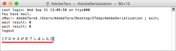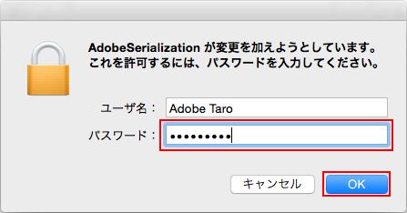 ターミナルが起動し、「AdobeSerialization が変更を加えようとしています。」と表示されたら、管理者権限のあるアカウントのパスワードを入力し、「OK」をクリックします。