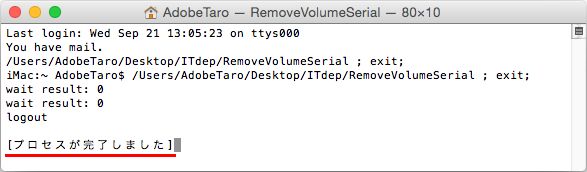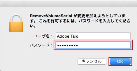 ターミナルが起動し、「RemoveVolumeSerial が変更を加えようとしています。」と表示されたら、管理者権限のあるアカウントのパスワードを入力し、「OK」をクリックします。