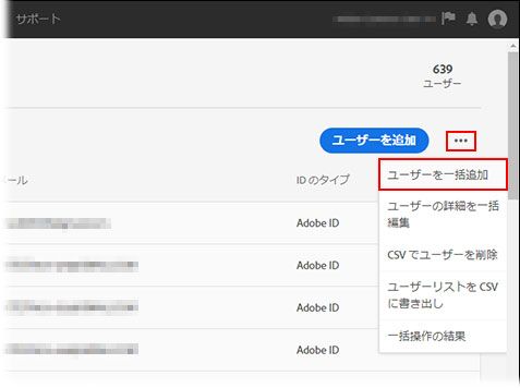 画面右上の「・・・」アイコンをクリックし、表示されたメニューから「ユーザーを一括追加」を選択します。