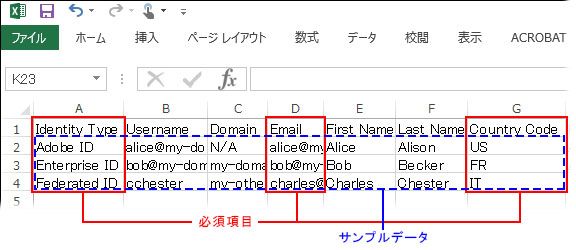 ダウンロードした CSV ファイルを開き、追加するユーザーの情報をサンプルの書式にしたがって入力します。「Identity Type」(Adobe ID、Enterprise ID、Federated ID のいずれか)、「Email」、および「Country Code」フィールドは必須項目です。