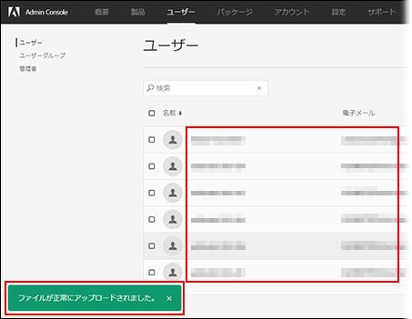 アップロードが完了すると、左下に「ファイルが正常にアップロードされました。」と表示され、ユーザーの一覧に CSV ファイルから読み込んだユーザーが表示されます。
