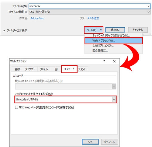 保存ダイアログボックスの「ツール」プルダウンリストから「Web オプション」を選択します。Web オプションダイアログボックスで「エンコード」タブを開き、「このドキュメントを保存する形式」で「Unicode (UTF-8)」を選択して「OK」をクリックし、ファイルを保存します。