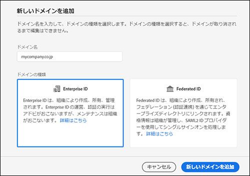 Enterprise ID および Federated ID による認証方式で運用する場合、「ドメインの追加」を行う必要があります。例えばユーザーのメールアドレスのドメインが「mycompany.co.jp」の場合、このドメインを Creative Cloud のログインアカウントとして有効化する手続きが必要となります。
