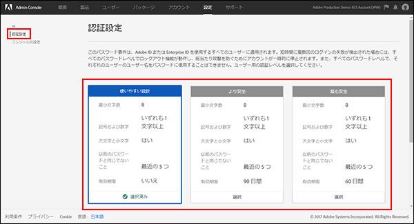 Adobe ID または Enterprise ID を使用するユーザー用のパスワード要件を選択することができます。