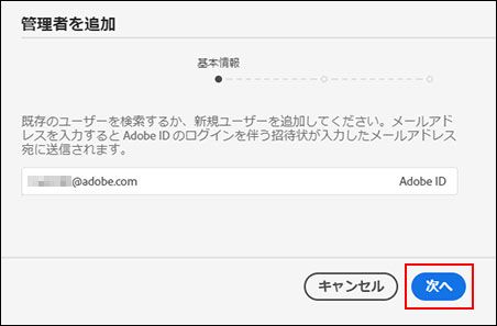 「管理者を追加」画面で管理者に指定するユーザーの電子メールアドレスを入力します。メールアドレスを入力すると、プルダウンで該当するアカウントが表示されます。表示されたアカウントをクリックして選択し、「次へ」ボタンをクリックします。