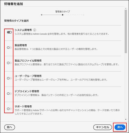 権限を付与する管理者タイプを ON (スイッチを右側)にし、「次へ」ボタンをクリックします。