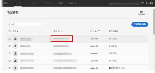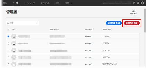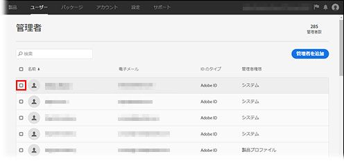 表示された管理者一覧で、権限を削除するアカウントのチェックボックスをクリックします。