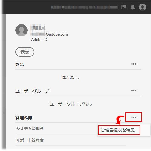 画面右側にアカウントの詳細が表示されます。管理権限項目の「・・・」ボタンをクリックし、「管理者権限を編集」を選択します。