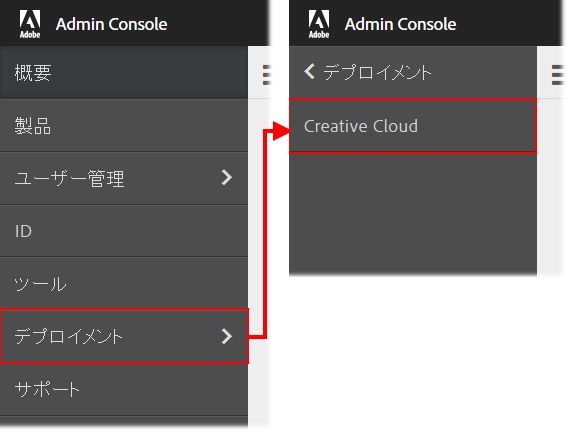画面左側の「デプロイメント」スナップインを選択後、「Creative Cloud」をクリックします。