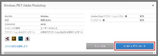 パッケージの内容が表示されます。対象のオペレーティングシステム、言語、32bit/64bit、ライセンスの種類、アップデートの有無、含まれるアプリケーションなど、インストール環境に適していることを確認したら、「ビルド+ダウンロード」ボタンをクリックします。