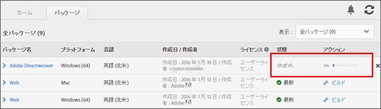 パッケージのビルド処理が開始され、Admin Console 上に進捗が表示されます。「×」をクリックして中断することもできます。