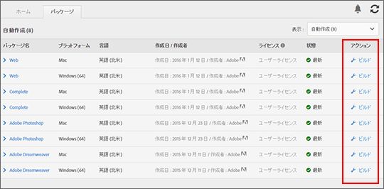 自動作成されたパッケージの一覧が表示されます。入手するパッケージ右側の「ビルド」リンクをクリックします。
