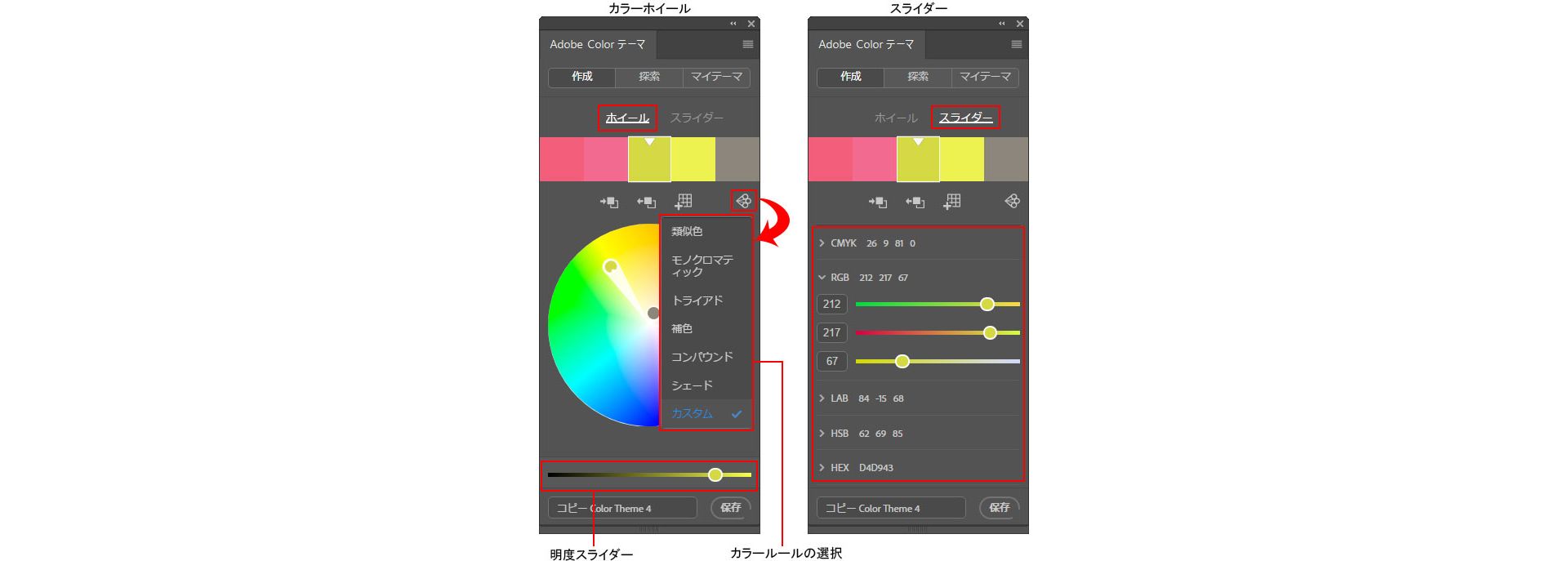 Adobe Color テーマパネルの「作成」タブには、テーマを作成または編集するための様々なツールが用意されています。Color CC Web サイトと同様に、カラールールやカラーホイール、整数値からカラーを設定することができます。