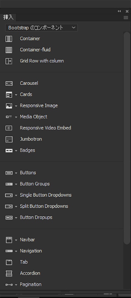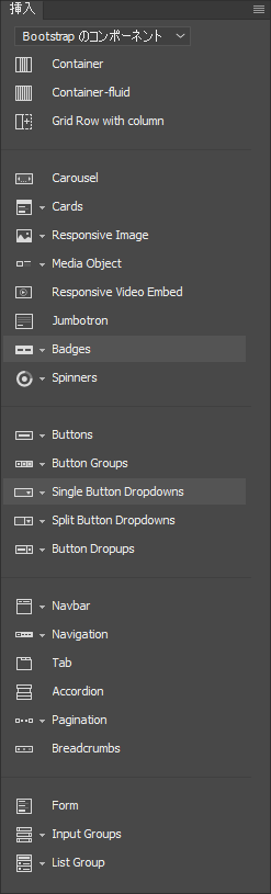 挿入パネルの「Bootstrap のコンポーネント」オプションにより、Dreamweaver で Web ページに追加できるすべての Bootstrap のコンポーネントを一覧表示できます。 HTML ページにリンクされている bootstrap.css ファイルの Bootstrap のバージョンに応じて、挿入パネルにそれぞれのコンポーネントが一覧表示されます。 例えば、Bootstrap v4.0.0 では、カードやバッジなどの追加のコンポーネントが表示されます。 同様に、グリフアイコン、パネル、ウェル、およびサムネイルコンポーネントは Bootstrap v3.3.7 でのみ利用可能です。 Bootstrap のバージョンに応じて、挿入パネルに対応するコンポーネントが表示されます。 また、Spinners コンポーネントは、Bootstrap v4.4.1 でのみ使用できます。
