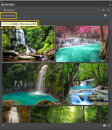 Adobe Stock は Creative Cloud ライブラリと緊密に統合されています。画像を検索して、任意の CC ライブラリに追加するには、次のいずれかの手順を実行します。