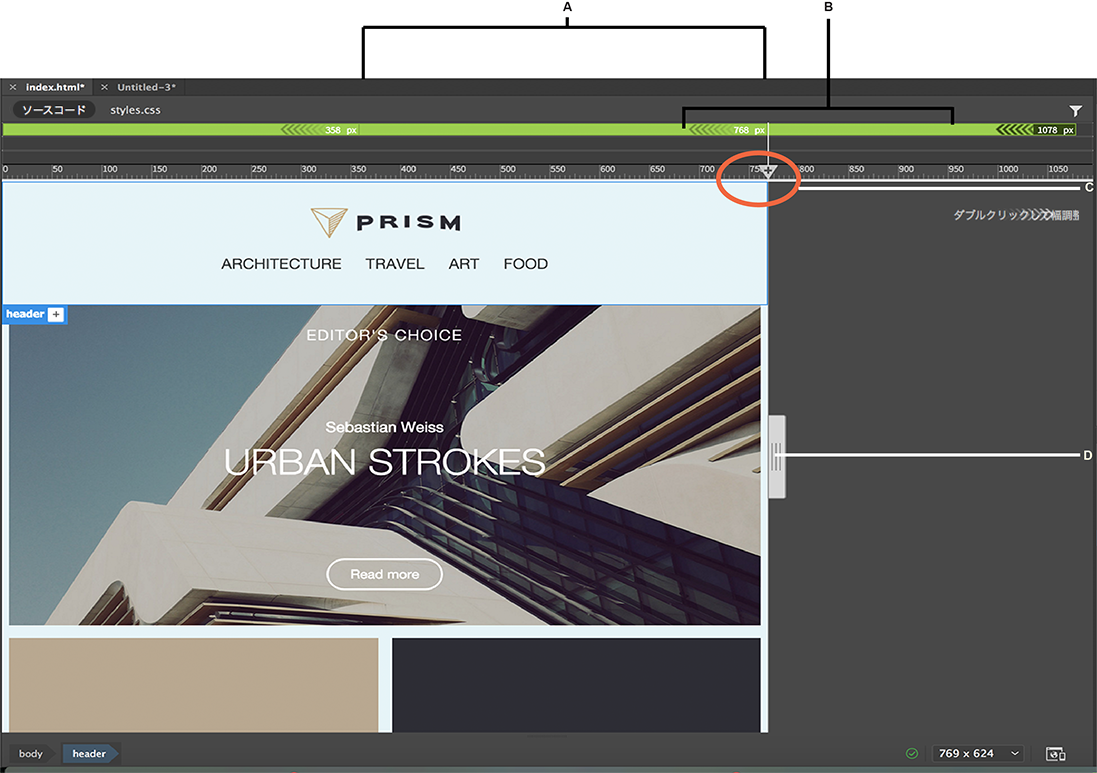 特定のサイズ(ブレークポイント)でページを表示するには、対応するメディアクエリーバーをクリックします。ドキュメントがブレークポイントにスナップされます。