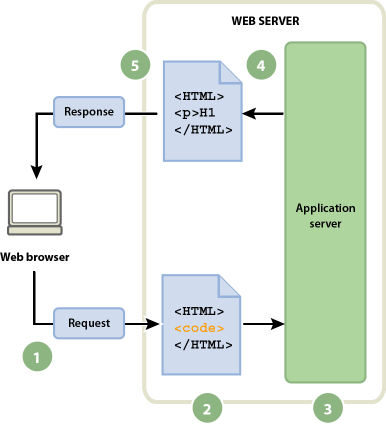 アプリケーションサーバーは、ページ内のコードを読み込み、そのコードに記述されている命令に従ってページを完成させ、コードをページから削除します。その結果、アプリケーションサーバーは Web サーバーに静的ページを返し、Web サーバーはそのページの要求元ブラウザーにページを返します。ページの受信時にブラウザーが受け取るのは、純粋な HTML だけです。以下は、処理の図です。