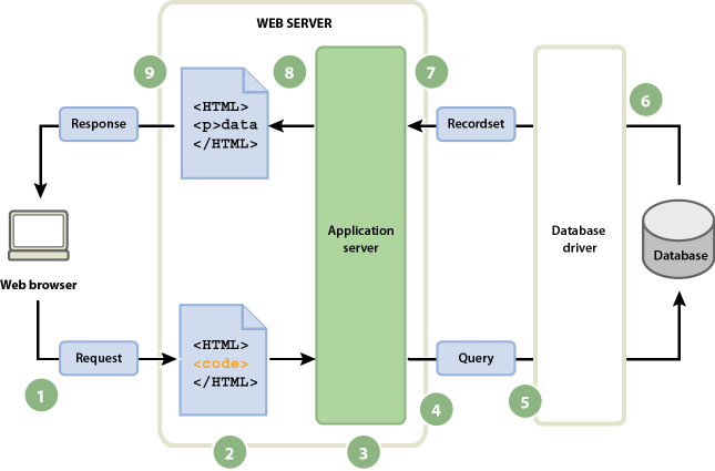A. Web ブラウザーが動的ページを要求します。 B. Web サーバーがページを検索してアプリケーションサーバーに渡します。 C. アプリケーションサーバーがページをスキャンして命令を検索します。 D. アプリケーションサーバーがクエリーをデータベースドライバーに送信します。 E. ドライバーがデータベースに対するクエリーを実行します。 F. レコードセットがドライバーに返されます。 G. ドライバーがレコードセットをアプリケーションサーバーに渡します。 H. アプリケーションサーバーがデータをページに挿入し、そのページを Web サーバーに渡します。 I. Web サーバーが完成したページを要求元ブラウザーに返します。
