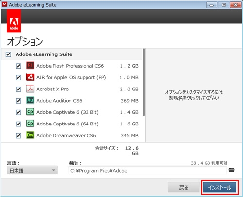 「オプション」画面が表示されます。初期設定ですべてのアプリケーションにチェックが入っていますが、必要なアプリケーションのみを選択することもできます。「インストール」をクリックします。