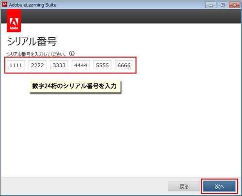 24 桁のシリアル番号を入力し、「次へ」をクリックします。