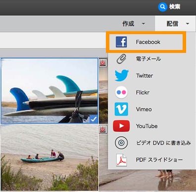 共有したいメディアファイルを選択し、配信/Facebook を選択します。