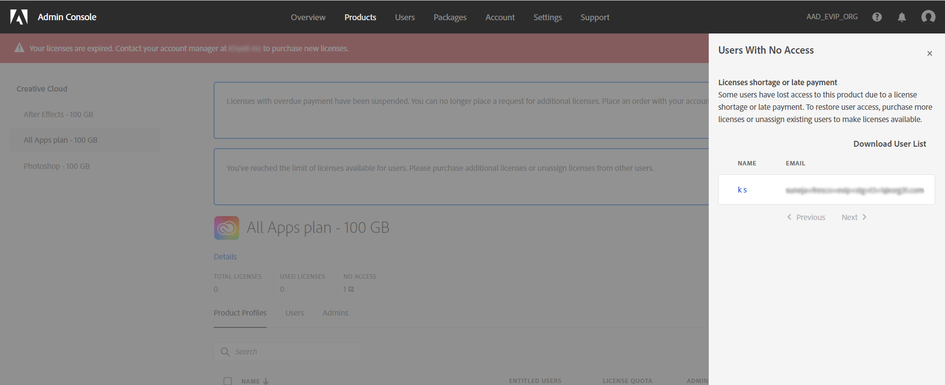 製品へのアクセスを失ったユーザーのリストを表示またはダウンロードするには、「すべてのユーザー」タブの「アクセスなし」をクリックします。