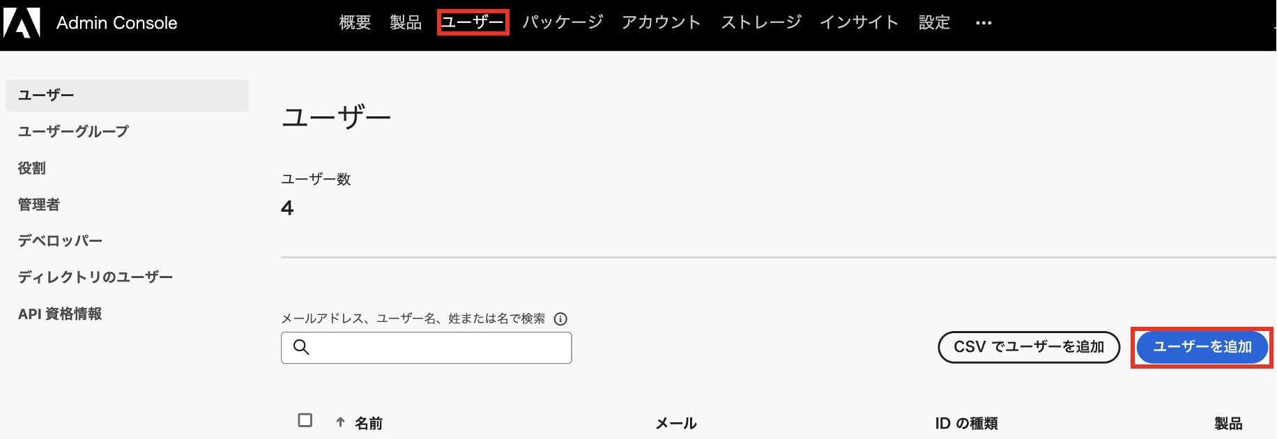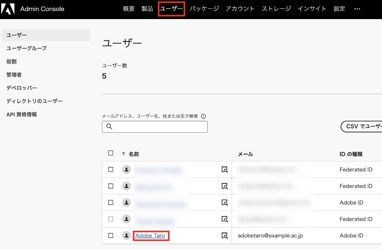 「ユーザー」メニューの「ユーザーを追加」ボタンから対象ユーザーがまだ登録されていない場合は適宜追加します。