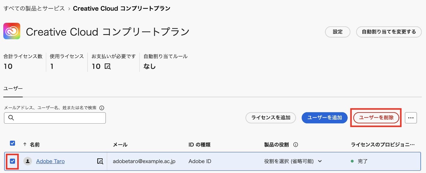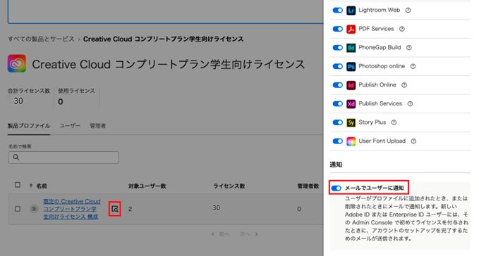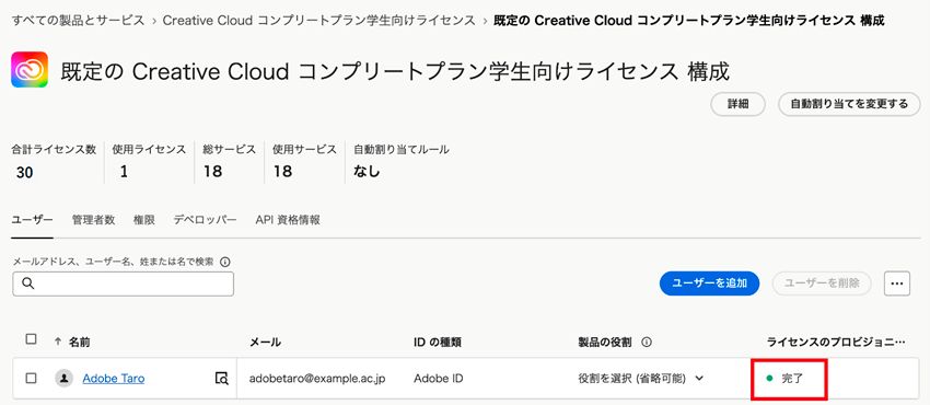 これで Creative Cloud コンプリートプラン学生向けライセンスが割り当てられます(ユーザーへの製品割り当ての通知メールの自動配信を抑止したい場合は、④をご参照いただき、ユーザーを製品プロファイルに割り当てる前に予めメール送信の設定を無効にします)。