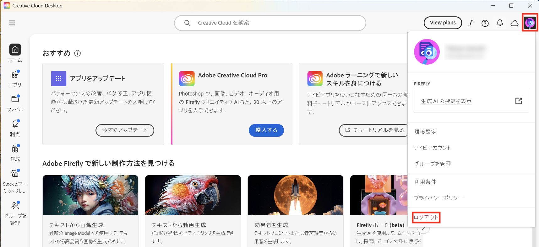 Creative Cloud デスクトップの右上のプロファイルアイコン から 「ログアウト」を選択します。ログアウトできましたら、 コンピュータ を再起動します。