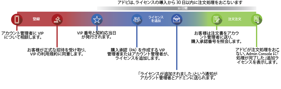 お客様に VIP ID が発行されたら、アカウントマネージャーに対して直接初回注文を行うことができます。 エンロールした後は、サブスクリプション期間中いつでもライセンスを注文できます。 契約応当日は、初回注文のアドビ受領日または初回購入承認日のいずれか早い日付から 12 か月* 後に自動的に設定されます。