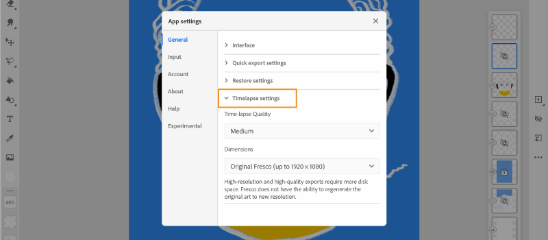 タイムラプスビデオの品質とサイズを設定できます。描画を開始する前に、必ずこれらのコントロールを設定してください。