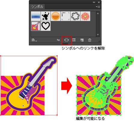 シンボルパネルの「シンボルへのリンクを解除」ボタン、またはコントロールパネルの「リンクの解除」ボタンをクリックすることで、アートワークを編集することが可能になります。