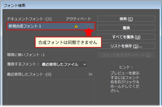 2014 年 6 月リリースの Illustrator CC 2014 から、同期されていない Adobe Fonts を含むドキュメントを開く際に自動で同期する機能が追加されました。しかし、合成フォントに含まれる Adobe Fonts は自動で同期されません。