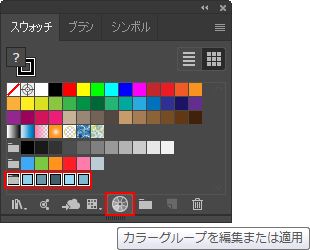 ウィンドウ/スウォッチ を選択してスウォッチパネルを表示します。追加したカラーテーマを選択し、パネル下部の「カラーグループを編集または適用」をクリックします。