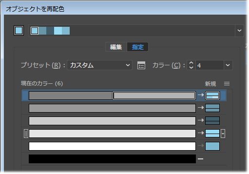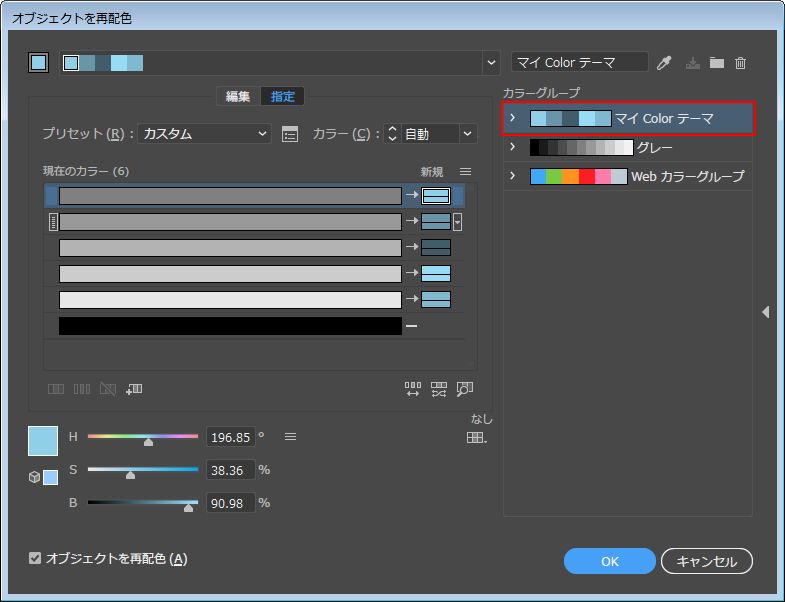 追加したカラーテーマが選択された状態でオブジェクトを再配色ダイアログが開きます。