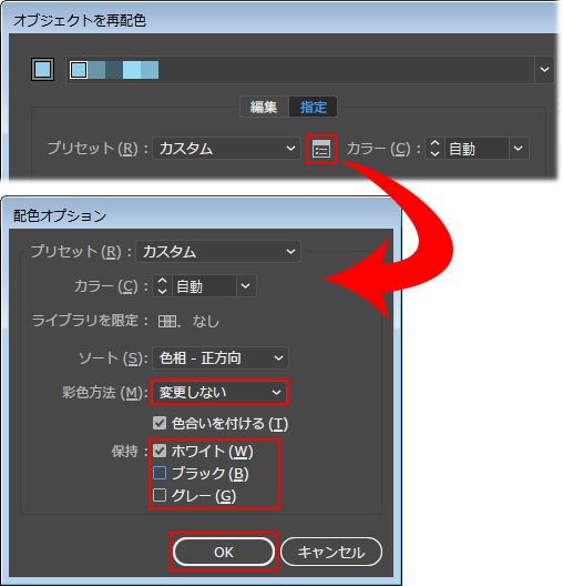 ※ここでは例としてホワイトにチェックを入れ、他の色は保持しません。 - 「OK」をクリックします。
