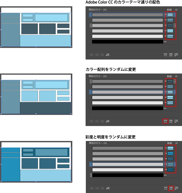 Adobe Color CC は、配色のパターンを作成するインターネット上のサービスです。作成したカラーテーマは公開して他のユーザーへ共有することもできます。その Adobe Color CC でマイテーマとして登録したものは Adobe Illustrator CC の Adobe Color テーマパネルでスウォッチに追加することで、スムーズに活用することができます。Illustrator CC には選択したオプジェクトの色を再配色できる機能があり、追加された Adobe Color CC のカラーテーマを使用することもできます。Web のデザインカンプなど、様々なカラ-バリエーションを簡単に作成することができます。
