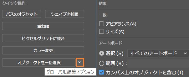 - 「アートボード」セクションで:- 「選択」ドロップダウンリストで、同様のオブジェクトをすべてのアートボード全体で検索するか、方向が特定のアートボード内で検索するかを指定します。
