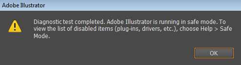エラーの原因となるファイルすべてが診断検査に記録された時点で Illustratorが起動し、Illustrator がセーフモードで実行中であることを示すダイアログボックスが表示されます。
