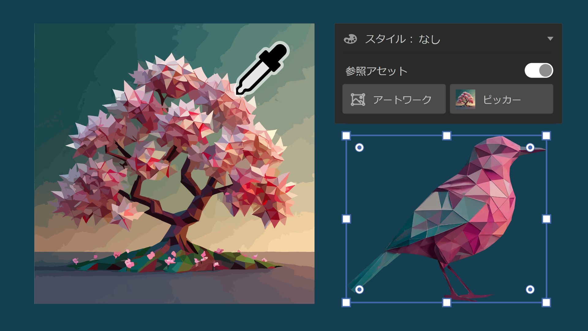 参照アートワークからスタイルを選択するか、選択したアートワークの周囲の領域からスタイルを使用して、被写体、シーン、アイコンを生成することができます。 さらに、カンバス上で選択したオブジェクトに関連付けられた出力バリエーションのみが表示されます。これにより、探しているバリエーションにすばやくアクセスできるようになります。