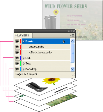 レイヤーに対する操作は、マスターを含むドキュメントのすべてのページに適用されます。例えば、ドキュメントのページ 1 を編集しているときにレイヤー 1 を非表示にすると、再び表示するよう操作しない限り、そのレイヤーはすべてのページで非表示になります。