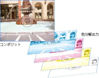 2 色以上を使うカラー印刷では、使用するインキの色の数だけ製版用のフィルムを作る必要があります。このためにドキュメントをプロセスカラーの CMYK、あるいは特色ごとに分けて出力することを、色分解出力といいます。