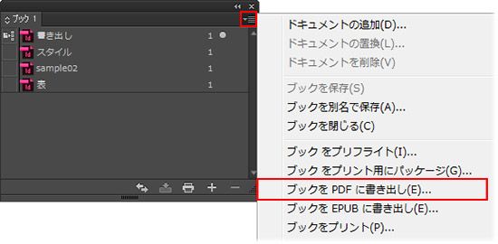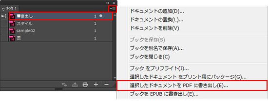 ブックパネル内で書き出すファイルを選択し、パネルメニューから「選択したドキュメントを PDF に書き出し」を選択します。