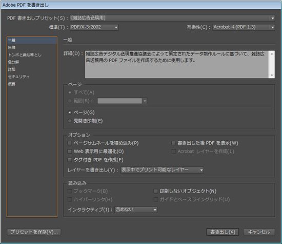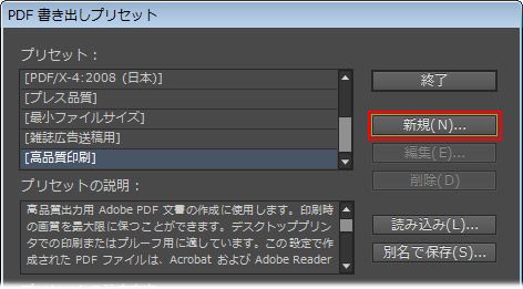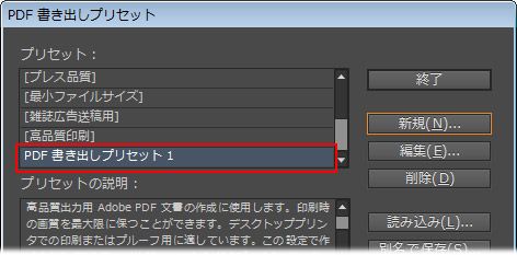 InDesign には、PDF/X や、プレス品質、雑誌広告送稿用などのプリセットが用意されていますが、独自にプリセットを作成して利用することができます。プリセットを作成するには、以下の操作を行います。