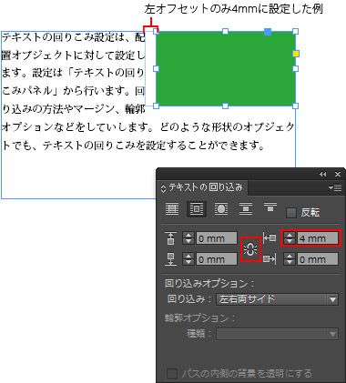 オフセットの値を調節し、オブジェクトとテキストの間隔を調節します。すべての設定を同一にするアイコンを解除すると、左右上下の値を個別に設定できます。