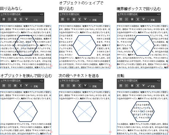 テキストの回り込みは、テキストの回り込み ウィンドウで設定を行います。テキストの回り込み ウィンドウでは、回り込み方法やオフセット値、輪郭オプションを設定することができます。「反転」チェックボックスを選択すると、オブジェクトの内側にテキストを回り込ませることができます。