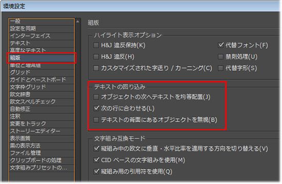 InDesign 環境設定で、テキストの回り込みに関する設定を行うことができます。設定内容は、すべてのドキュメントに適用されます。