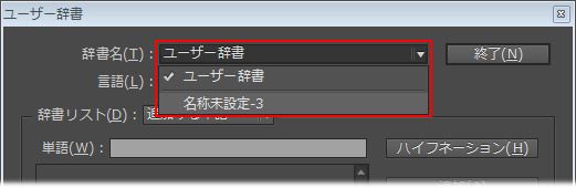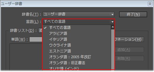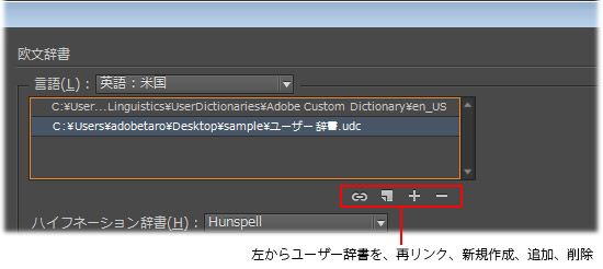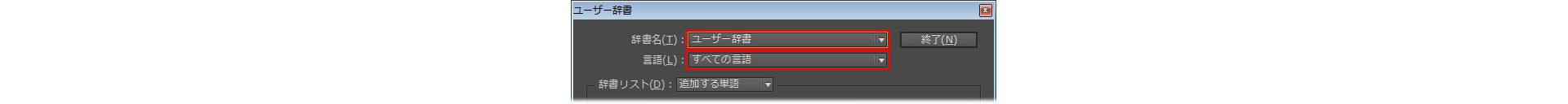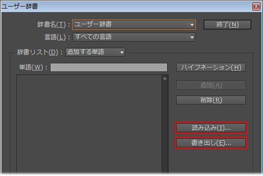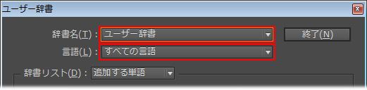 新規ユーザー辞書を作成したり、InDesign の旧バージョンのユーザー辞書や既存の他のユーザー辞書を追加することができます。追加した辞書は、すべての InDesign ドキュメントで使用できます。
