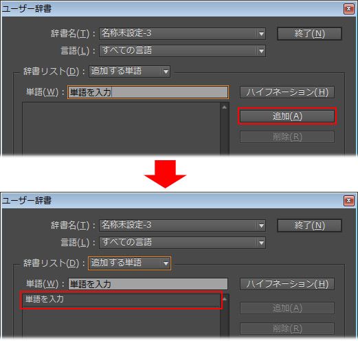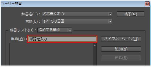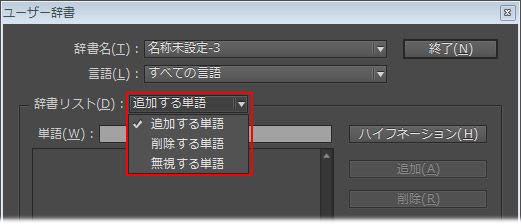 欧文辞書 ダイアログボックスでは、単語の追加および削除を行うことができます。また、登録されている単語のハイフネーションを設定することも可能です。